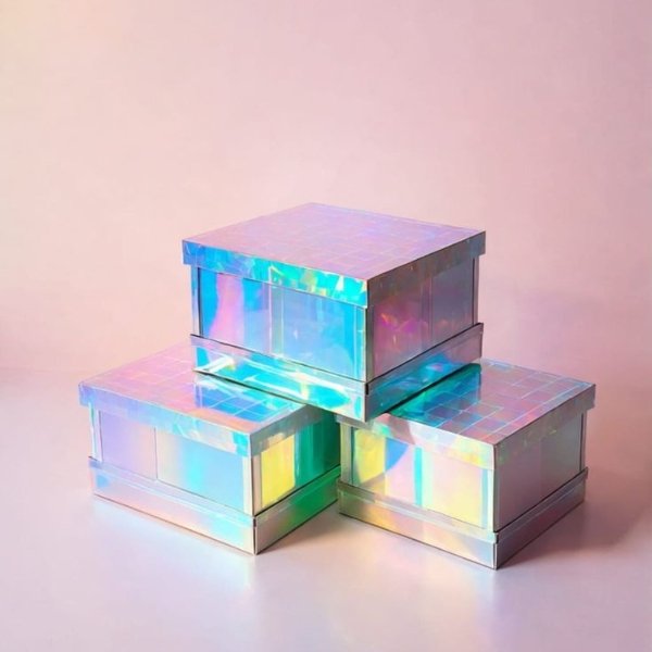 Holographic foil diffracts light and reveals the colors of the rainbow at various angles.